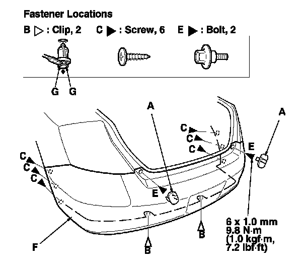 1. Remove the caps (A). Remove the clips (B), the screws (C, D), and the bolts (E) securing the rear bumper (F).