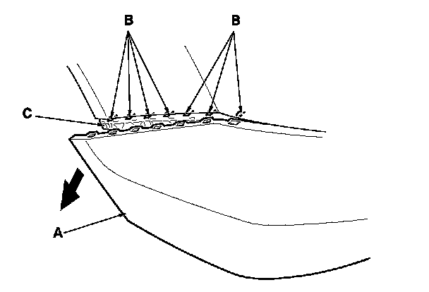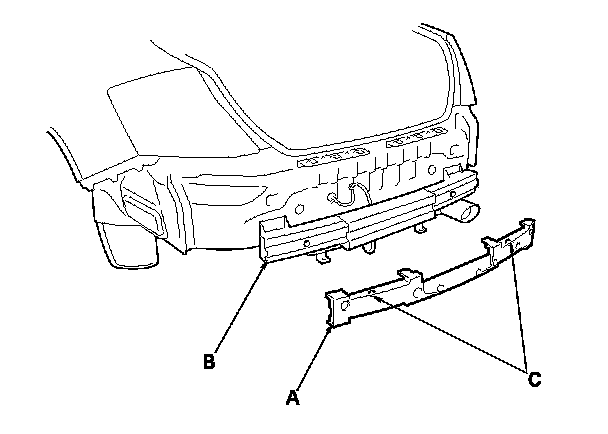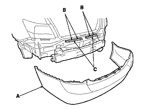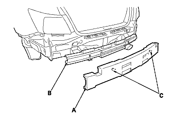 5. Remove the rear bumper absorber (A) from the rear bumper beam (B) by pulling the absorber to release the projections (C) on both sides.