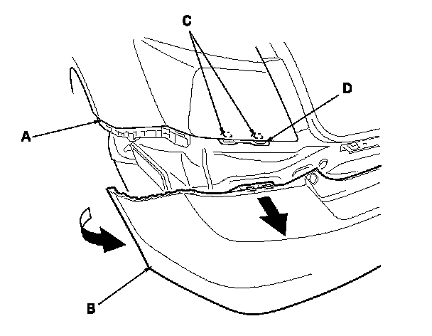 3. With the help of an assistant, while pulling the wheel arch portion away from the side spacers (A), pull the rear bumper (B) to release the bumper from the hooks (C) on the side bracket (D).