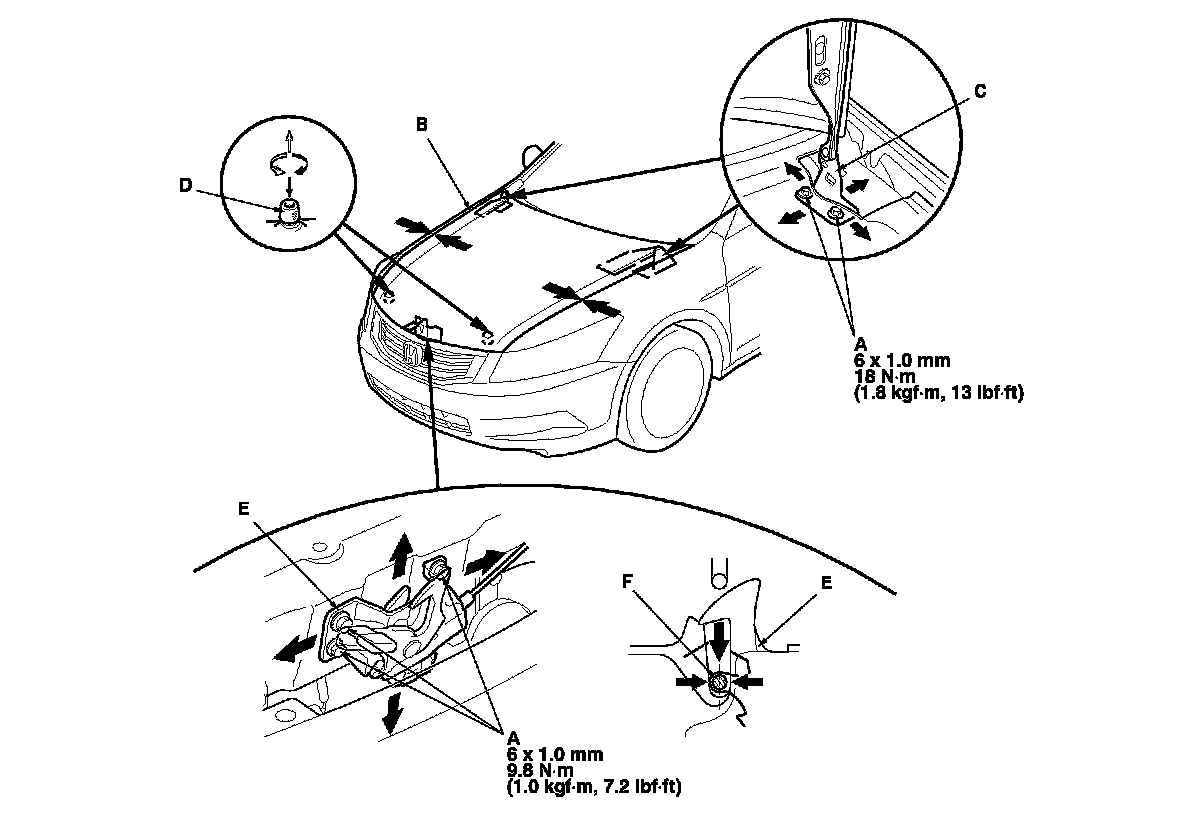 3. Adjust the hood (B) alignment in the following sequence: