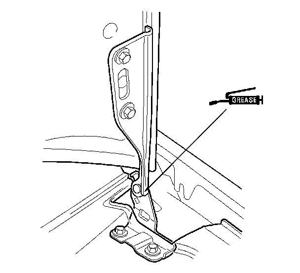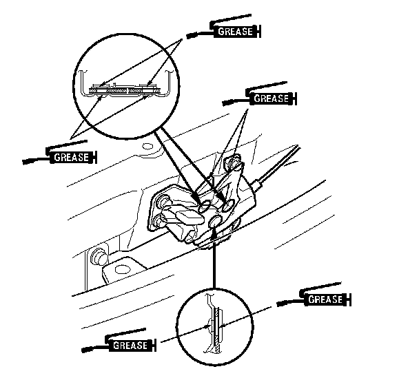 8. Apply multipurpose grease to the hood latch and the hood hinges as indicated by the arrows.