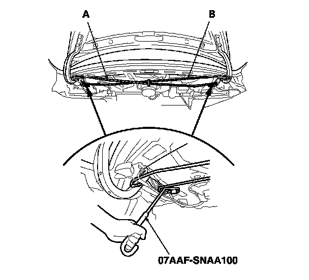 2. Put on gloves to protect your hands. Remove the torsion bars with the torsion bar assembly tool from both trunk lid hinges. First remove the left torsion bar (A), then remove the right torsion bar (B).