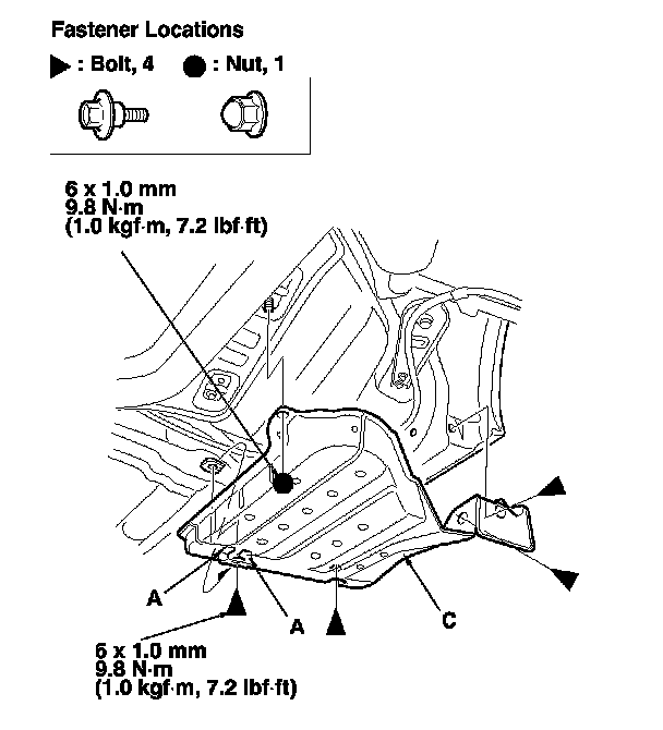 1. Remove the bolts and the nut, and release the hooks (A), then remove the left middle floor undercover (B) and the right middle floor undercover (C).