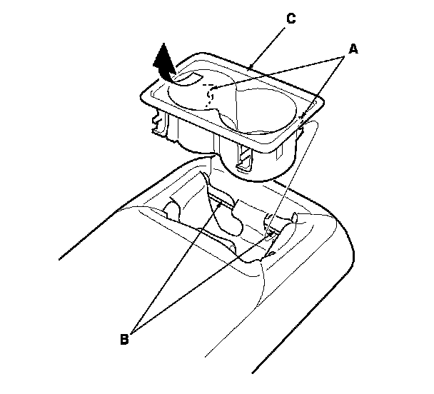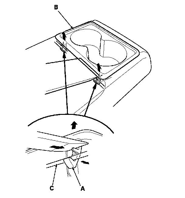 1. Using the appropriate trim tool, push on the rear hooks (A) to pull up the beverage holder (B), then release the hooks from the wire (C).