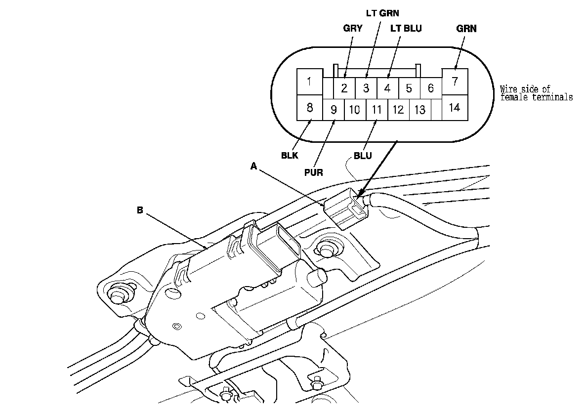 3. Disconnect the 14P connector (A) from the moonroof control unit (B).