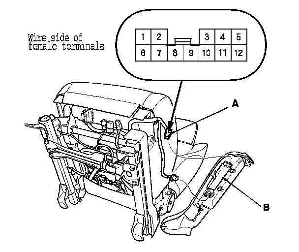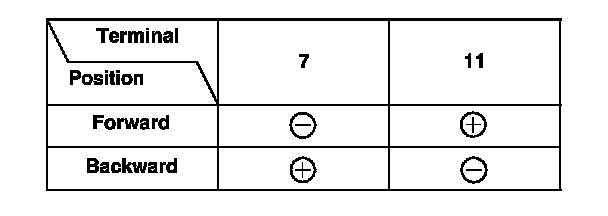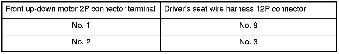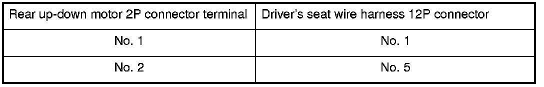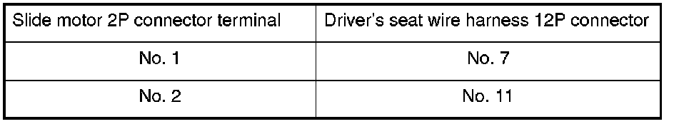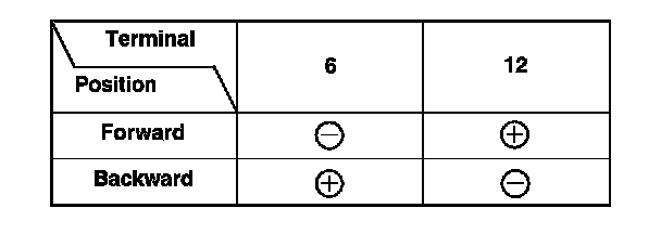 4. At the 12P connector of the driver's seat wire harness side, test the motor by applying battery power and ground to the terminals according to the table.