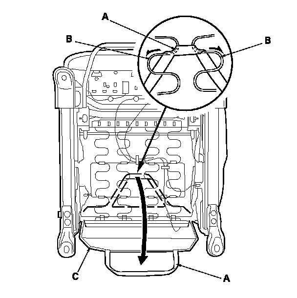 3. From under the seat cushion, release the elastic strap (A) from the seat cushion frame springs (B), then pull the under cover (C) of the back cover back.