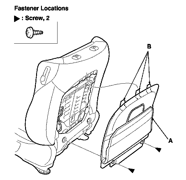 7. Remove the screws, then gently pull down the back cover (A) to release the hooks (B) from the seat-back frame, and remove the cover.