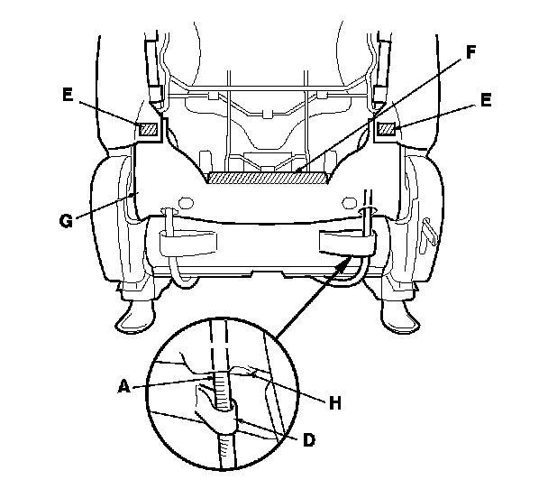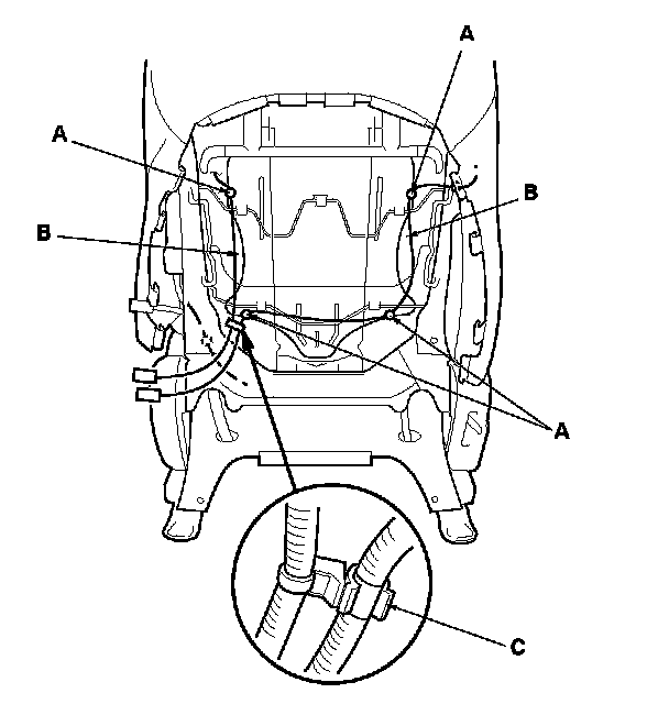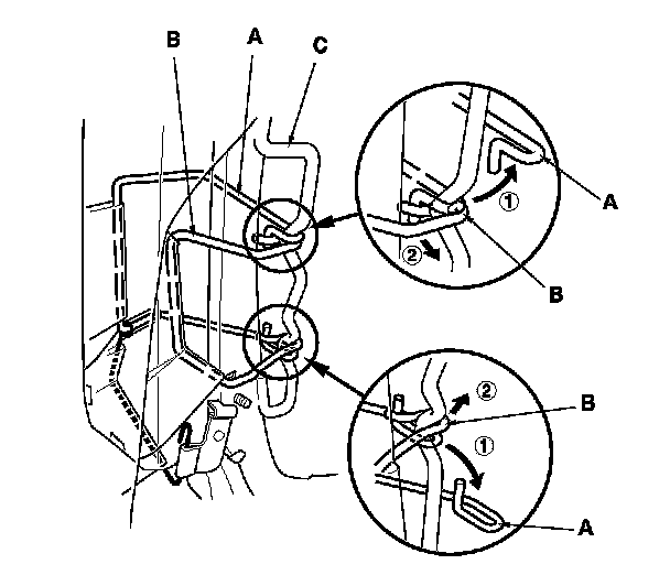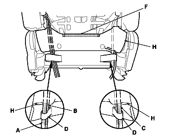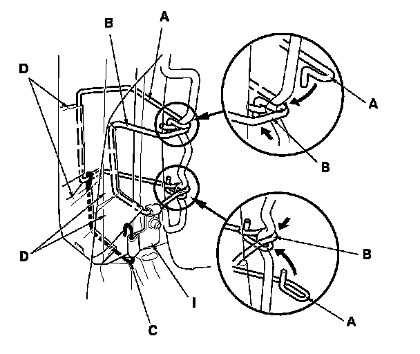 - Reinstall airbag wires A and B, and the bracket (I) of airbag wire C securely.