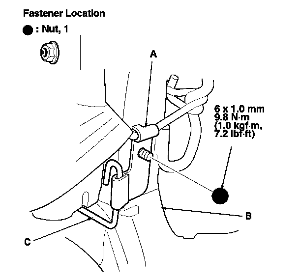 10. Remove the nut, then release the bracket (A) of airbag wire C from the seat-back frame (B).