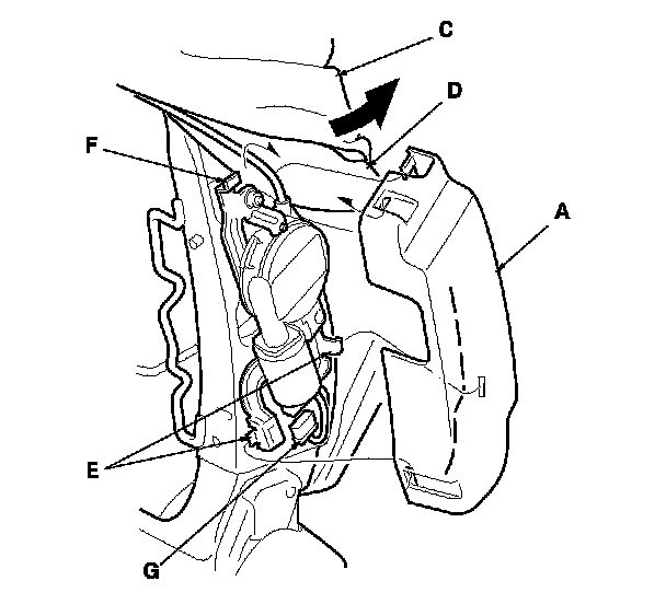 8. Pull the side airbag harness (A) on all types of seats, the recline motor harness (B) and the seat-back heater harness (C) on the driver's 10-way power seat out through the loop(s) (D). Release the Velcro fasteners (E) except on the leather seat cover, the hook strip (F), pull the seat-back cover (G) back, then pull the harness(es) out through the harness hole(s) (H) in the seat-back cover.