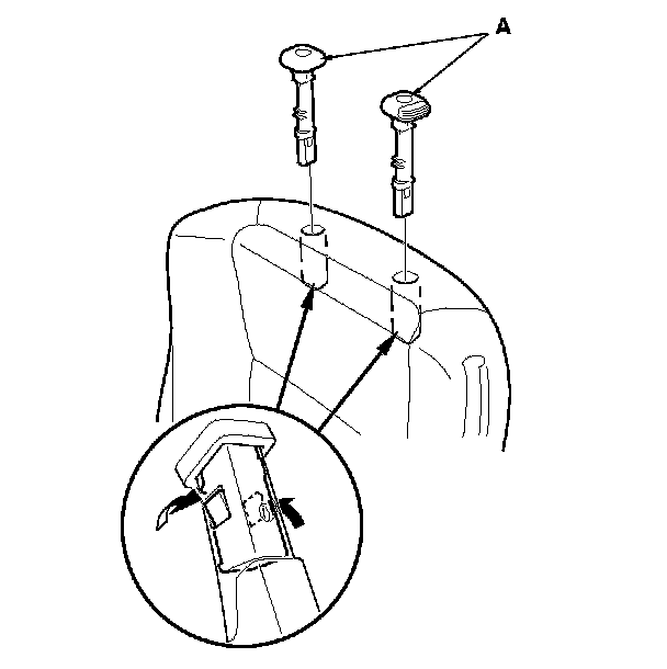 16. Pull out the head restraint guides (A) while pinching the tabs on the end of the guides, and remove them.