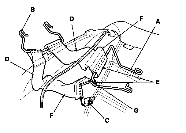 19. Remove airbag wire B from the outside reinforcing cloths (D). Pull airbag wire A out through loops (E) of the inside reinforcing cloths (F) and through loop (G) of airbag wire C. Remove airbag wires A and C.