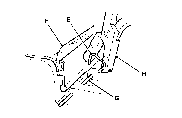 5. Detach the harness clip(s) (E), and remove the wire ties (F). On the manual height adjustable seat, pry up the hooks (G) of the harness holder (H), then release the holder from the seat cushion frame spring (I).