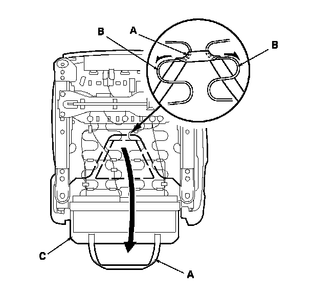 2. With back cover: From under the seat cushion, release the elastic strap (A) from the seat cushion frame springs (B), then pull the under cover (C) of the back cover back.