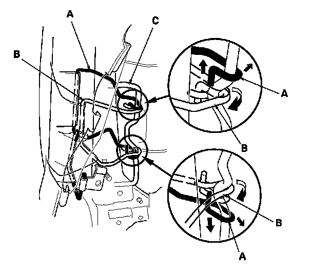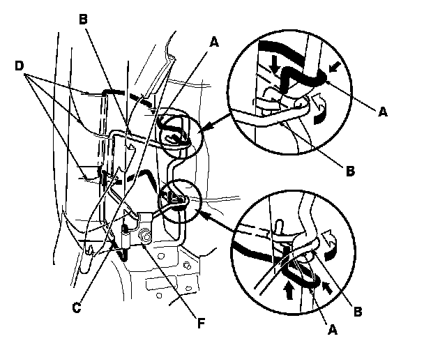 - Reinstall airbag wires A and B, and the bracket (F) of airbag wire C securely.