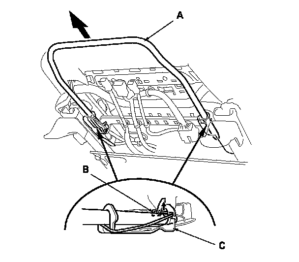 2. Lift up the front seat, and pull the slide lever (A) out while prying up the spring (B) from the lever holders (C) of both seat tracks, then remove the lever.