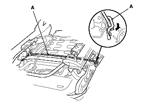 4. Lever a hooked shaped end of the front seat torsion bar (A) down using a large flat-tip screwdriver.