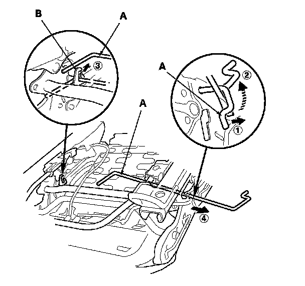 6. Remove the other side end of the torsion bar from the hook (B), then remove the torsion bar from the seat frame.