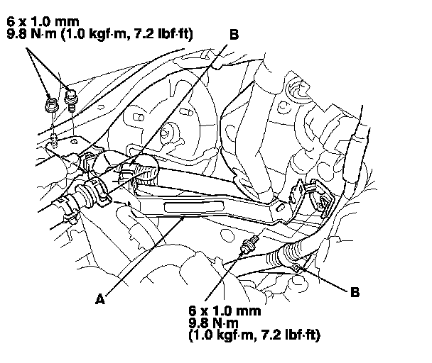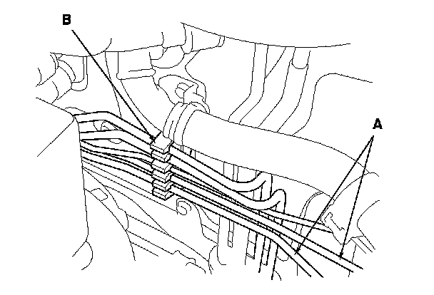 5. Remove the under-hood fuse/relay box bracket (A), then remove the engine wire harness clamps (B).