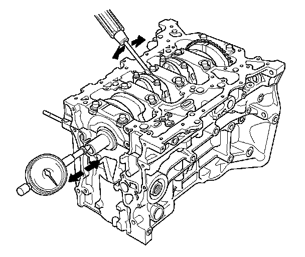 5. Push the crankshaft firmly away from the dial indicator, and zero the dial against the end of the crankshaft. Then pull the crankshaft firmly back toward the indicator; the dial reading should not exceed the service limit.