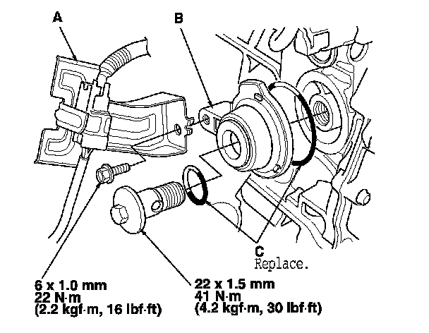 3. Install the engine oil gallery cap with new O-rings (C), then install the harness bracket.