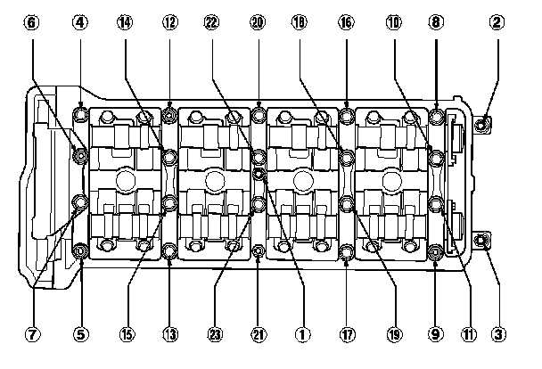 3. Remove the camshaft holder bolts. To prevent damaging the camshafts, loosen the bolts, in sequence, two turns at a time.