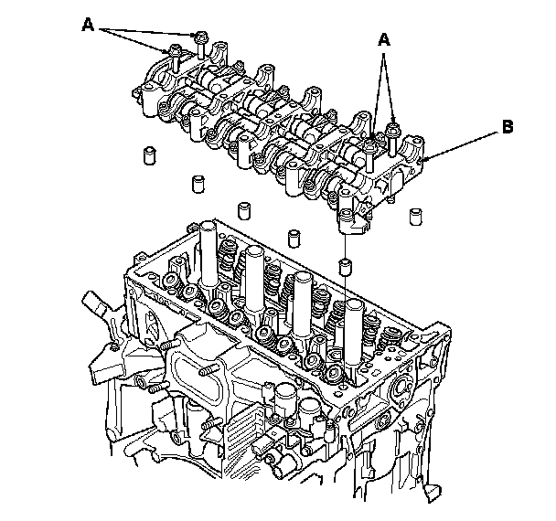 5. Insert the bolts (A) into the rocker shaft holder, then remove the rocker arm assembly (B).