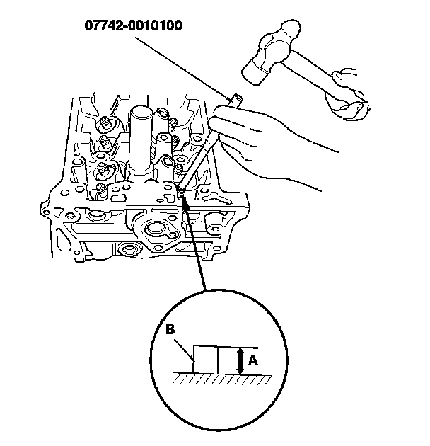 2. As illustrated, use a commercially available air-impact valve guide driver (A) modified to fit the diameter of the valve guides. In most cases, the same procedure can be done using the valve guide driver, 5.5 mm and a conventional hammer.