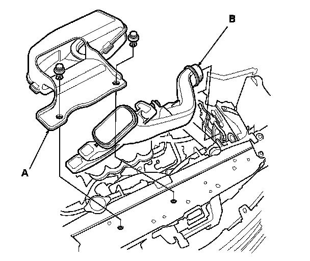 6. Disconnect the breather pipe (A), then remove the intake air duct (B).