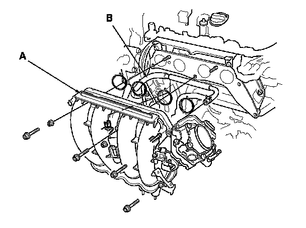 12. Remove the intake manifold (A), then disconnect the positive crankcase ventilation (PCV) hose (B) from the intake manifold.