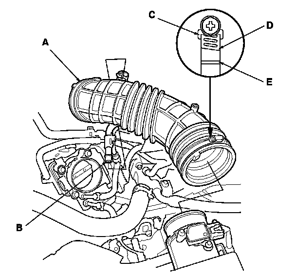 NOTE: When tightening the screw of the hose band (C), align the edge of the hose band (D) with the mark (E) painted on the hose band. If you tighten the screw over the mark, replace the hose band.