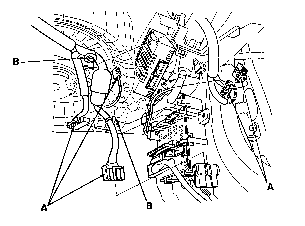 5. Remove the bolts (A) and the wire harness clip (B). Then cut the plastic cross brace (C) in the glove box opening with diagonal cutters in the area shown. Retain the plastic cross brace to be reinstalled later.