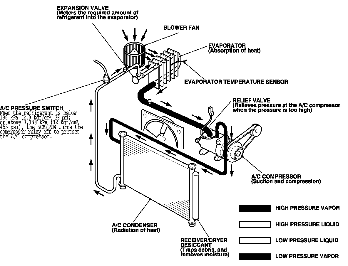 - All A/C system parts (A/C compressor, discharge line, suction line, evaporator, A/C condenser, receiver/dryer, expansion valve, O-rings for joints) are designed for refrigerant R-134a. Do not exchange with R-12 parts.