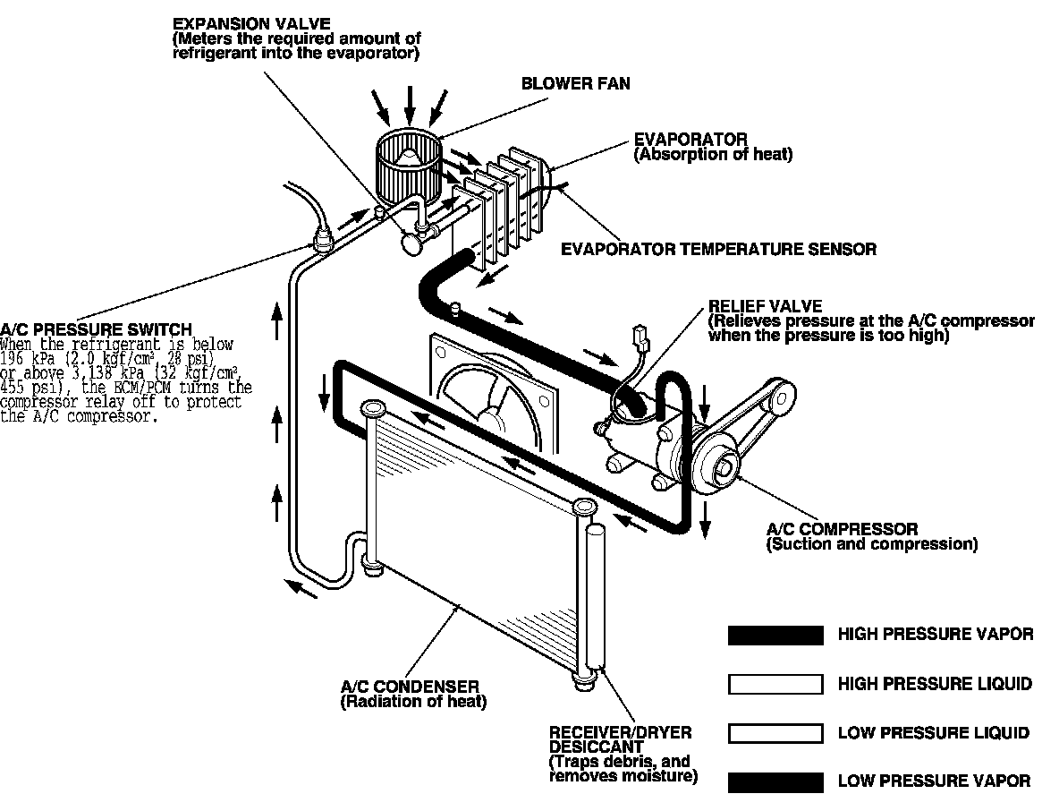 The air conditioning (A/C) system removes heat from the passenger compartment by transferring heat from the ambient air to the evaporator. The A/C system refrigerant expands in the evaporator, and the evaporator becomes very cold and absorbs the heat from the ambient air. The blower fan pushes air across the evaporator where the heat is absorbed, and then it blows the cool air into the passenger compartment.