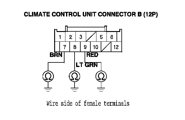 7. Check for continuity between body ground and the climate control unit connector B (12P) No. 7, 8, and No. 9 terminals individually.