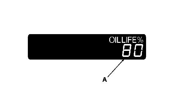 1. The remaining engine oil life on the engine oil life indicator (A) is displayed as a percentage on the information display. To see the current engine oil life, turn the ignition switch to ON (II), then push and release the Select/Reset knob repeatedly until the engine oil life is displayed.