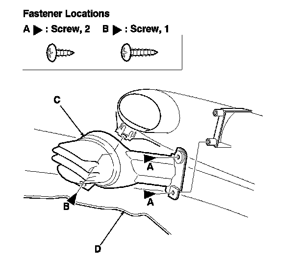 2. Remove the screws (A, B), then remove the front bumper fog light cover (C) from the front bumper (D).
