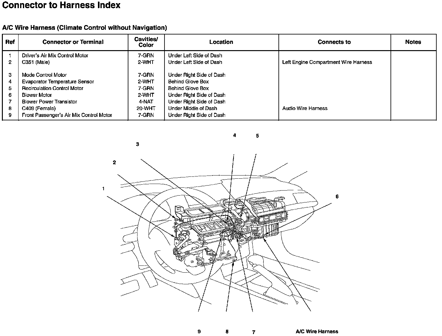 A/C Wire Harness Connector and Harness Locations (Climate Control Without Navigation)