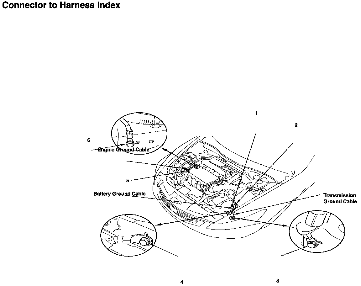 Battery Ground Cable, Engine Ground Cable, and Transmission Ground Cable Connector and Harness Locations