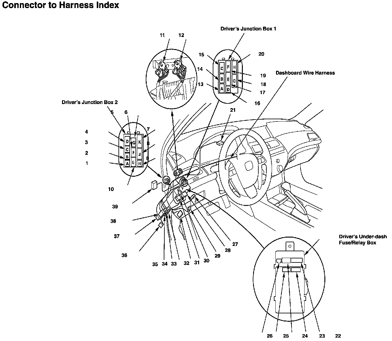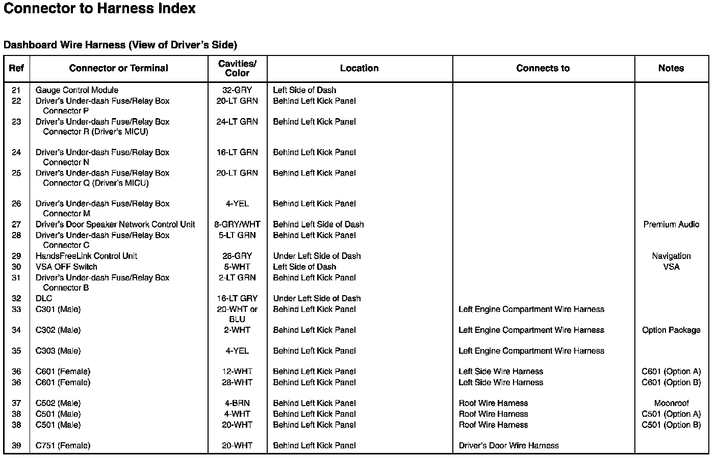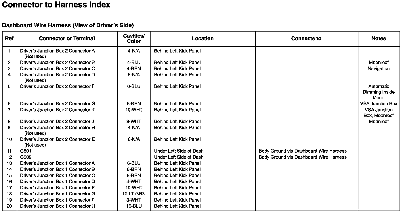 Dashboard Wire Harness (View of Driver's Side) Connector and Harness Locations