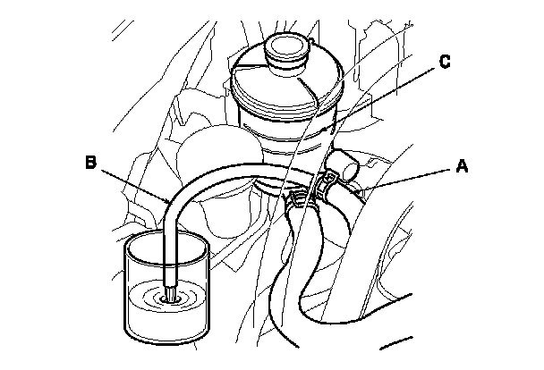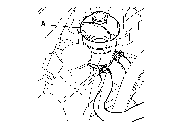 1. Remove the reservoir from its holder. Raise the reservoir, then disconnect the return hose (A) to drain the reservoir. Take care not to spill the fluid on the vehicle. Wipe off any spilled fluid at once.