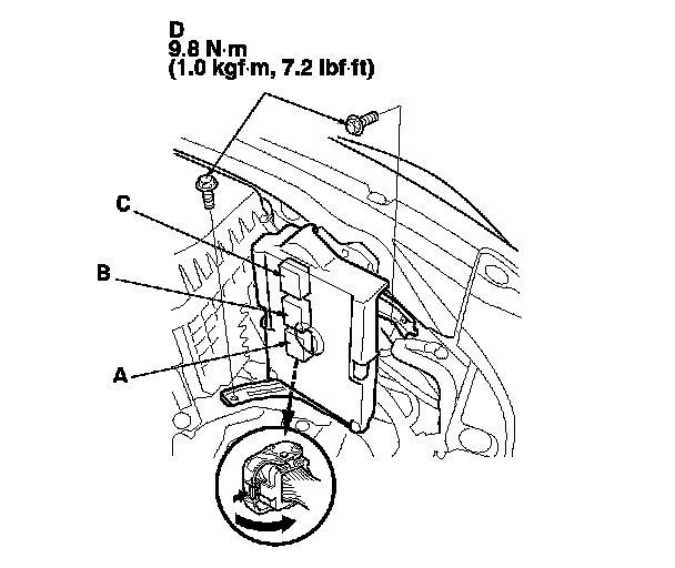 10. Disconnect ECM/PCM connectors A, B, and C, then remove the ECM/PCM assembly (E).