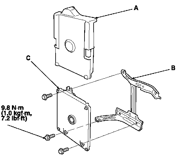 11. Remove the cover (A) and the bracket (B) from the ECM/PCM (C).