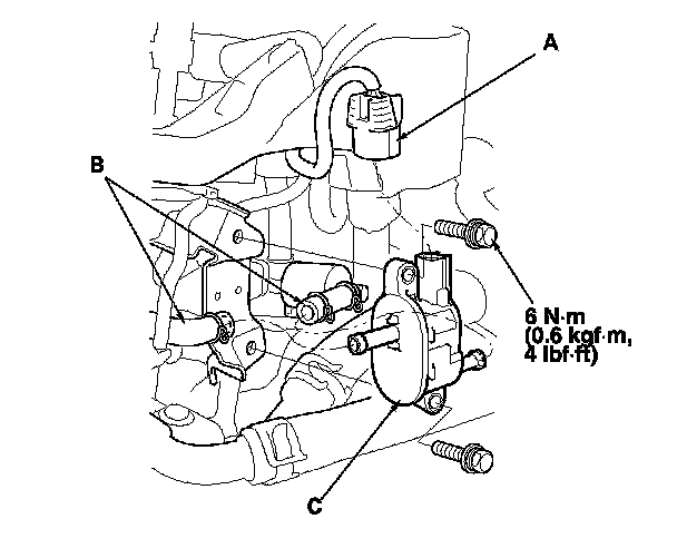 2. Disconnect the hoses (B), then remove the EVAP canister purge valve (C).