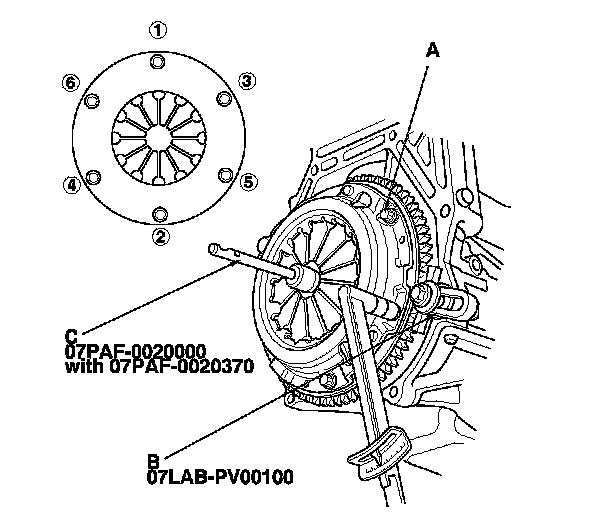 Torque the pressure plate mounting bolts in a crisscross pattern. Tighten the bolts in several steps to prevent warping the diaphragm spring.