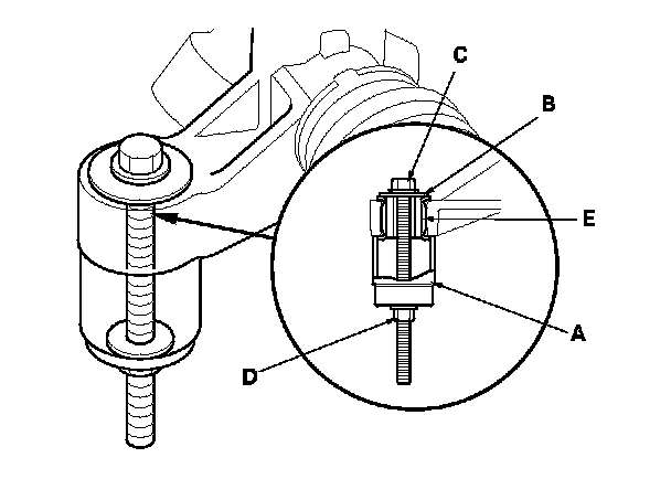 3. Hold the flange bolt with a wrench, and tighten the nut with a wrench. Remove the gearbox mount cushion (E).
