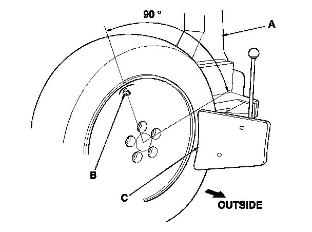 - Position the wheel as shown so the valve stem (B) is 90 degrees from the bead breaker (C) as shown.