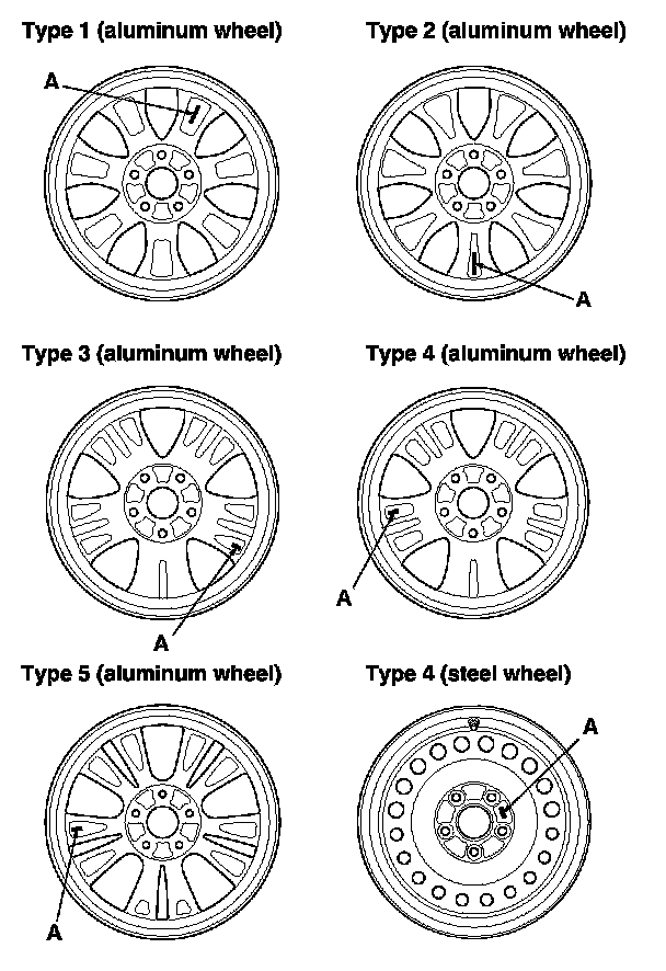 - Use only wheels that have a "TPMS", "TA0", or "TE0" stamp (A) on the inside of the aluminum wheels, and the outside of the steel wheels.