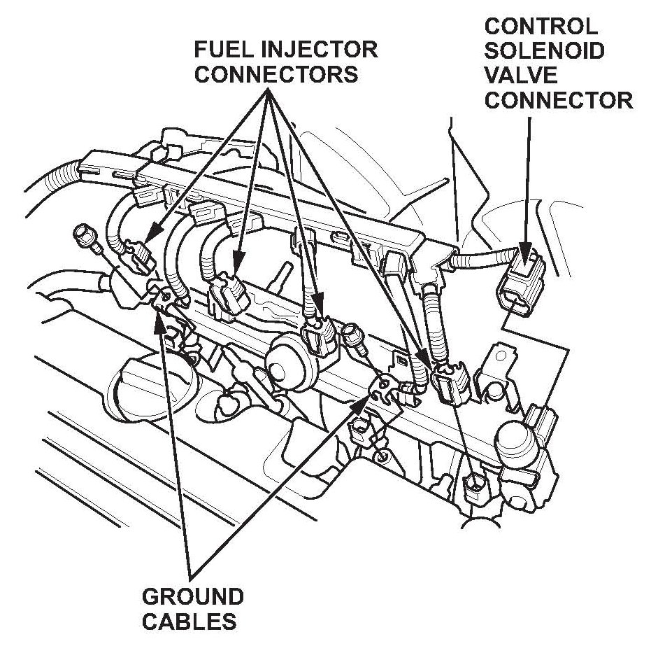 93. Connect the four fuel injectors, the engine mount control solenoid connector, and the ground cables.